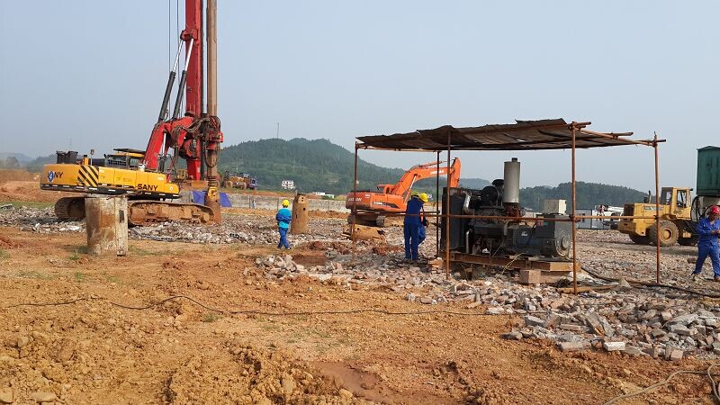 施工內(nèi)容及工程量:灌注樁鋼筋籠制作、運(yùn)輸及安放,鉆孔樁成孔、商品砼采買(mǎi)、砼灌注。旋挖鉆孔灌注樁樁基工程共完成1244根,樁徑800mm,樁身混凝土強(qiáng)度等級(jí)為C30,完成總米數(shù)23458.18米,設(shè)計(jì)混凝土方量11791.37方,實(shí)際灌注混凝土15624m³,后壓漿共使用900噸復(fù)合硅酸鹽水泥,加工鋼筋791.56t。