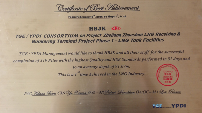 近日我公司收到TGE/YPDI的浙江舟山LNG儲(chǔ)罐接收站項(xiàng)目“最佳成績(jī)證書”牌匾,內(nèi)容:TGE/YPDI 管理層對(duì)2016年2月19日至2016年5月11日期間河北建勘及其員工以高質(zhì)量和嚴(yán)格的HSE管理標(biāo)準(zhǔn)在82天內(nèi)完成319根樁基且平均深度在91.07米的成績(jī)表示感謝。