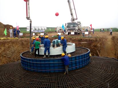 我公司承擔(dān)了該風(fēng)電場的土建工程及接地,施工內(nèi)容主要包括風(fēng)電機組基礎(chǔ)33座、變壓器基礎(chǔ)33座,共完成土石方開挖與回填40112m3,完成混凝土12578m³。