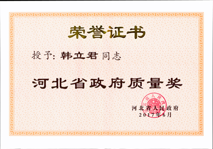 我公司獲得了由河北省人民政府頒發(fā)的“2016年河北省政府質(zhì)量獎”組織提名獎;公司董事長韓立君同志榮獲“河北省政府質(zhì)量獎”個(gè)人獎。省委領(lǐng)導(dǎo)為董事長頒發(fā)了獲獎證書和獎杯。