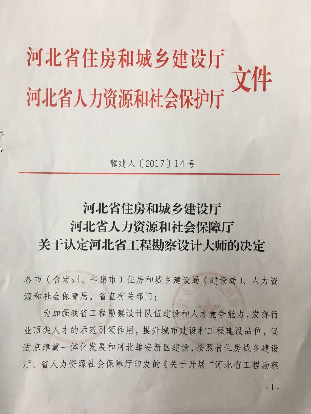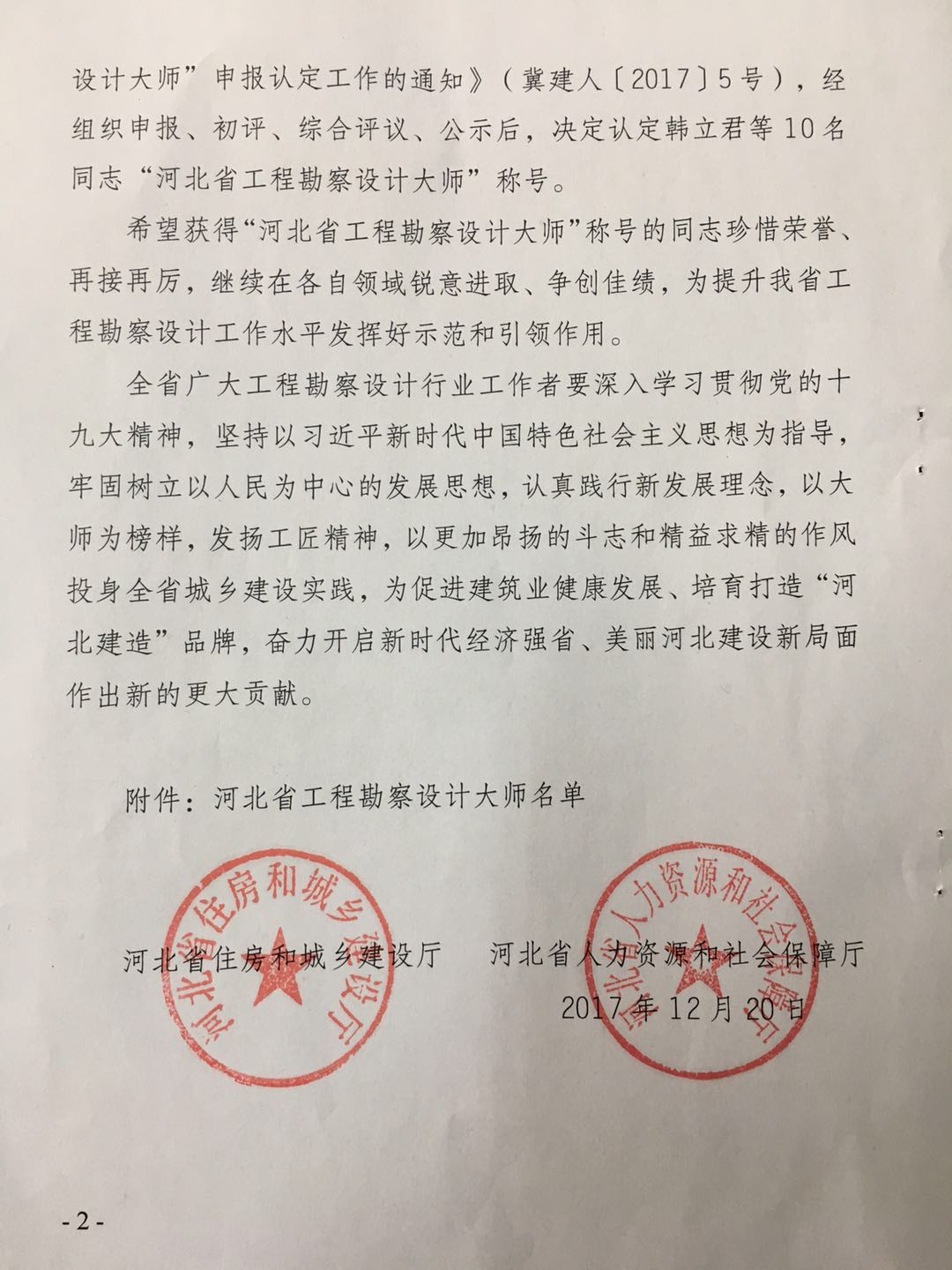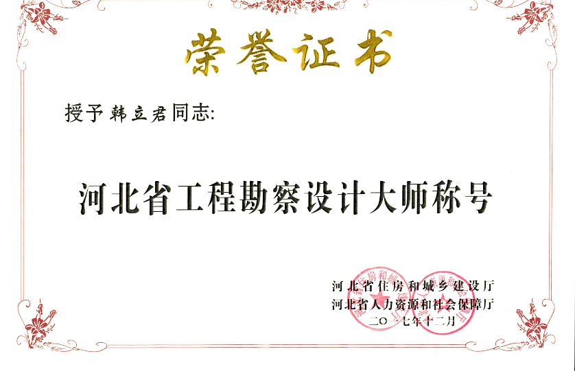 近日,從河北省住房和城鄉(xiāng)建設(shè)廳、河北省人力資源和社會保護(hù)廳聯(lián)合印發(fā)的《關(guān)于認(rèn)定河北省工程勘察設(shè)計大師的決定》獲悉,公司董事長韓立君榮獲“河北省工程勘察設(shè)計大師”稱號。