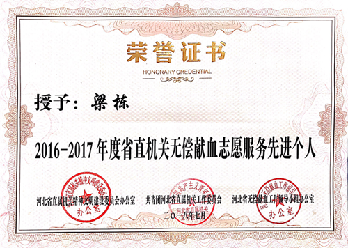 梁棟同志被授予2016-2017年度省直機(jī)關(guān)無(wú)償獻(xiàn)血志愿服務(wù)先進(jìn)個(gè)人