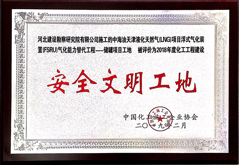 我公司天津液化天然氣項目被中國化工施工企業(yè)協(xié)會評為“2018年度化工工程建設(shè)安全文明工地”