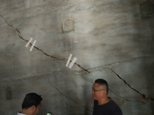 本工程勘察場地位于聊城市茌平縣,茌平華宇氧化鋁公司場內(nèi)2個堿罐與其北側(cè)2個配電室樓體周邊為本次的勘察區(qū)域。堿罐直徑8m,高10m,兩堿罐間距1.7m,現(xiàn)罐區(qū)周圍約20m×20m范圍內(nèi)土體發(fā)生膨脹,局部地面產(chǎn)生地表裂縫,兩個配電室樓體南側(cè)出現(xiàn)裂縫,裂縫位置距堿罐約30m。