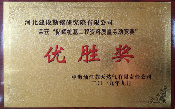 由我公司承建的江蘇液化天然氣(LNG)接收站1#、2#儲罐樁基工程已于2019年09月01日施工完成,2019年12月01日全部檢測完成,樁基檢測結(jié)果全為Ⅰ類樁。在施工期間的質(zhì)量安全管理及我公司項目部的工作作風和工作態(tài)度受到了總包、監(jiān)理及業(yè)主單位的充分肯定。在江蘇液化天然氣(LNG)接收站工程項目完工之際,為我公司頒發(fā)了“優(yōu)秀承包商”證書。在建設(shè)單位組織的“儲罐樁基工程資料質(zhì)量勞動競賽”中,通過項目部的努力及公司的全力幫助,獲得優(yōu)勝獎。