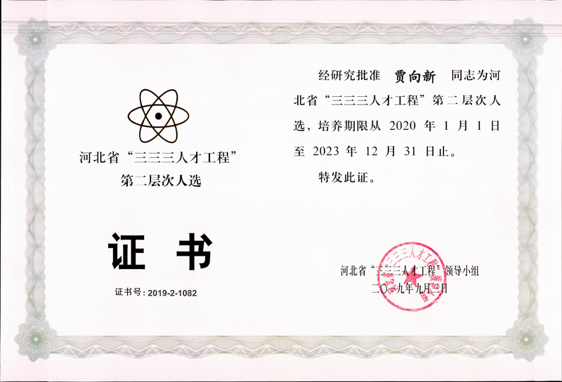 經(jīng)公司申報、石家莊市人力資源和社會保障局推薦,河北省“三三三人才工程”領(lǐng)導(dǎo)小組批準(zhǔn),我公司賈向新同志榮獲2019年度河北省“三三三人才工程”第二層次人選。