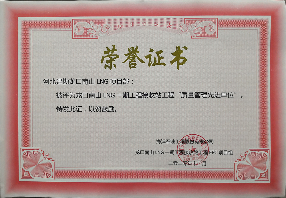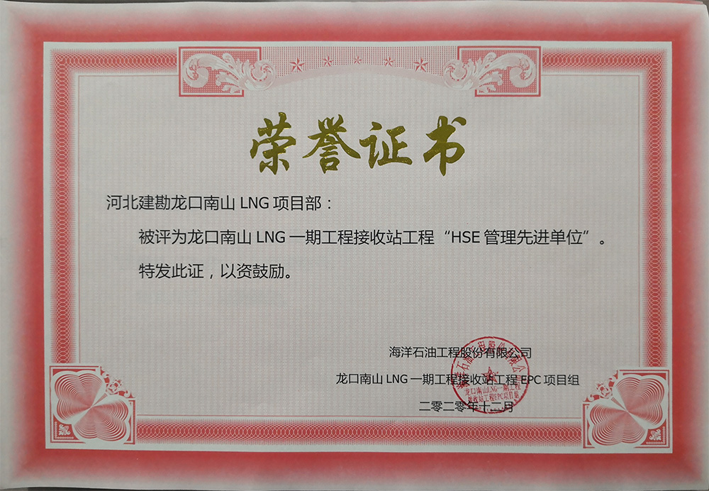 2020年12月,公司收到海洋石油工程股份有限公司發(fā)來的表揚信,對我公司在龍口南山LNG一期工程接收站工程EPC項目儲罐樁基工程標(biāo)段一施工過程中,面對施工現(xiàn)場地質(zhì)情況復(fù)雜、新工藝、施工難度大、氣候炎熱多雨、新冠疫情、人材機緊缺等不利因素,按合同要求順利完成了一標(biāo)段1#和2#儲罐3497根振沖碎石樁和720根樁柱一體化灌注樁全部施工任務(wù),給予了高度認(rèn)可和好評,并表示感謝!我公司被評為“質(zhì)量管理先進(jìn)單位”和“HSE管理先進(jìn)單位”并頒發(fā)了榮譽證書,同時對先進(jìn)個人頒發(fā)了“優(yōu)秀項目管理者”、 “HSE管理先進(jìn)個人”、 “質(zhì)量管理先進(jìn)個人”榮譽證書。