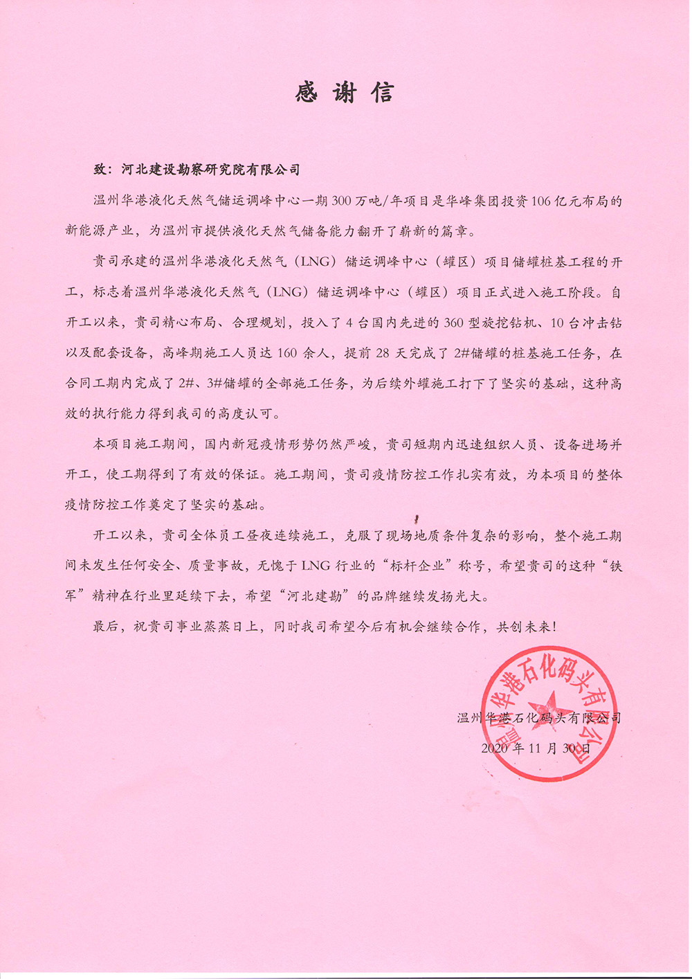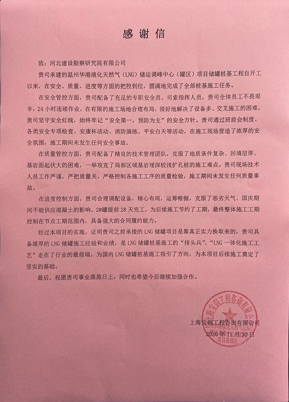溫州華港LNG項(xiàng)目自2020年8月19日開工以來,面對(duì)地質(zhì)情況復(fù)雜、工期緊、任務(wù)重、施工條件差等諸多不利因素,項(xiàng)目部精心部署工作,科學(xué)組織生產(chǎn),全體員工大力發(fā)揚(yáng)“不怕累、不怕苦、全力打造精品工程”的精神,在嚴(yán)格落實(shí)疫情防控措施的同時(shí),嚴(yán)把進(jìn)度關(guān)、質(zhì)量關(guān)、安全關(guān),確保制定的施工計(jì)劃有序推進(jìn),最終高標(biāo)準(zhǔn)完成項(xiàng)目施工,兌現(xiàn)了公司的承諾,為溫州華港LNG工程的竣工投產(chǎn)奠定了堅(jiān)實(shí)的基礎(chǔ)。為此,業(yè)主、總包、監(jiān)理紛紛發(fā)來表揚(yáng)信,對(duì)我項(xiàng)目部提出表揚(yáng),并衷心祝愿我公司發(fā)展業(yè)績蒸蒸日上,再創(chuàng)輝煌。