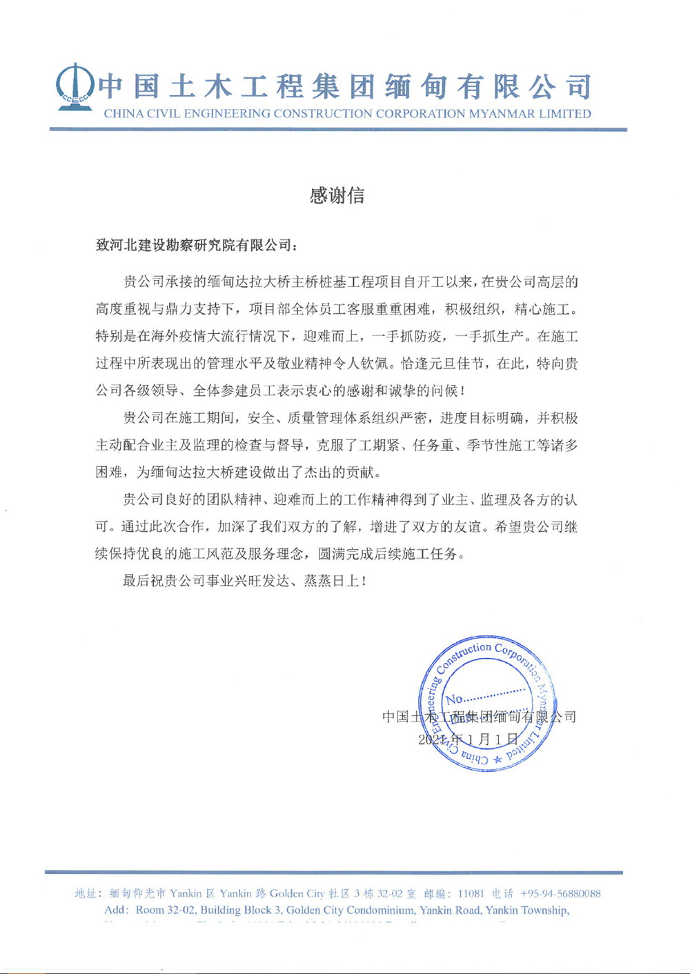 中國土木工程集團(tuán)緬甸有限公司感謝我公司在緬甸達(dá)拉大橋主橋樁工程施工過程中,項目部全體員工迎難而上、一手抓防疫、一手抓生產(chǎn),克服了工期緊、任務(wù)重、季節(jié)性施工等諸多困難,為緬甸達(dá)拉大橋建設(shè)做出了杰出貢獻(xiàn)。