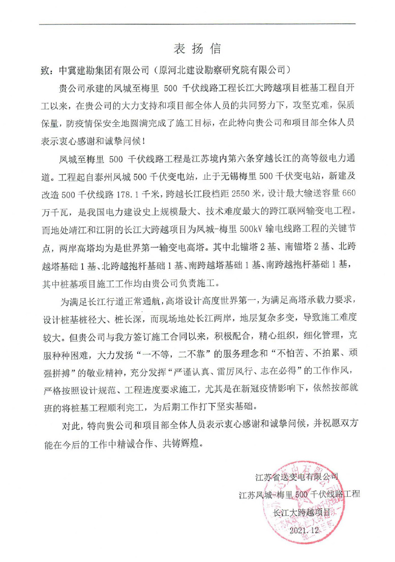 江蘇鳳城梅里500千伏線路工程長江大跨越項目樁基工程,甘肅國能靖遠風電項目電場及配套110KV輸變電工程賀寨柯風電場風機基礎及樁基工程項目業(yè)主向我公司發(fā)來表揚信,并頒發(fā)了“進度、質(zhì)量管理先進單位”榮譽證書,同時,武衛(wèi)新、朱凱云、黃長楠被評為“優(yōu)秀項目管理者”榮譽稱號。