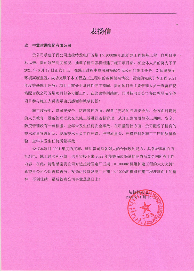 近日,由我公司承建的達拉特發(fā)電廠五期1×1000MW機組擴建項目樁基工程,收到達拉特發(fā)電廠工程指揮部發(fā)來的表揚信,對我司承接的樁基施工質(zhì)量、安全文明施工、進度管控及各方面的配合表示認可。
