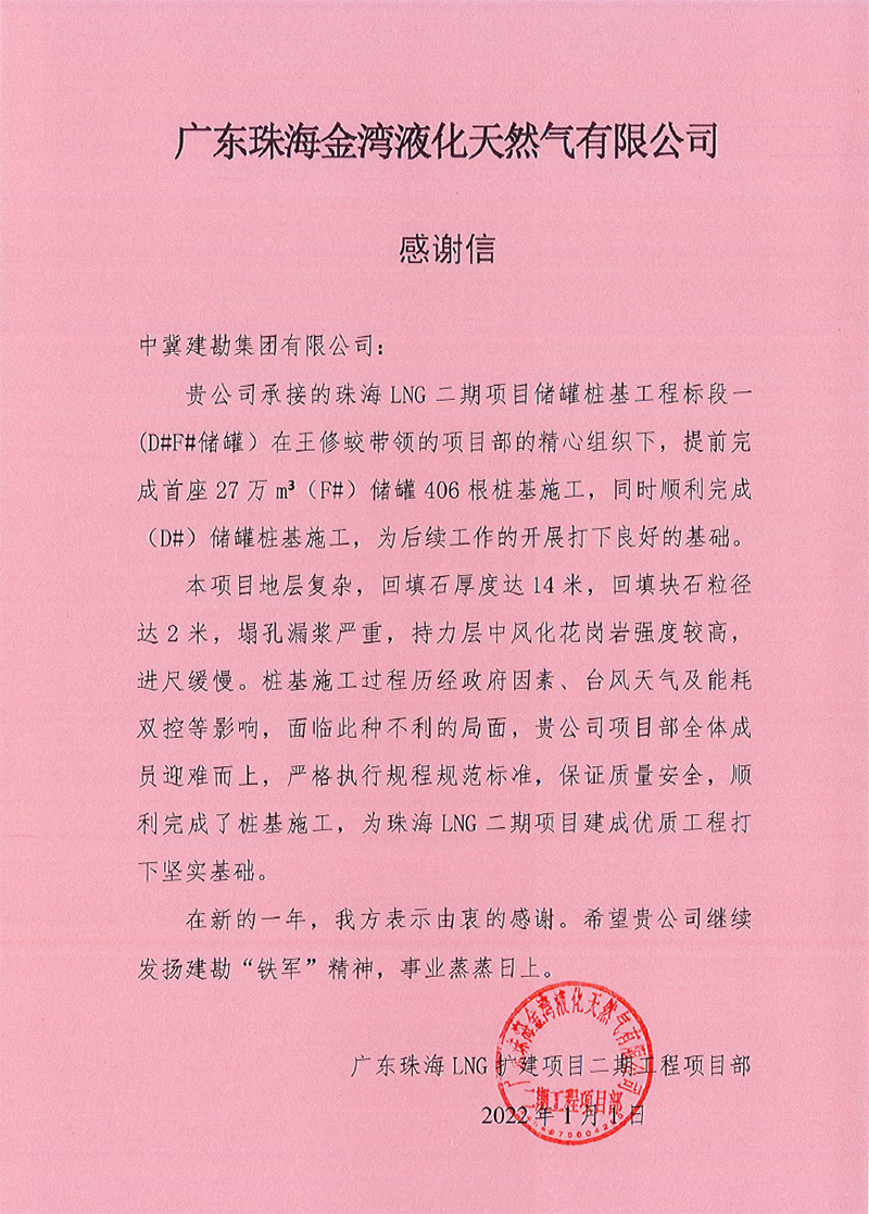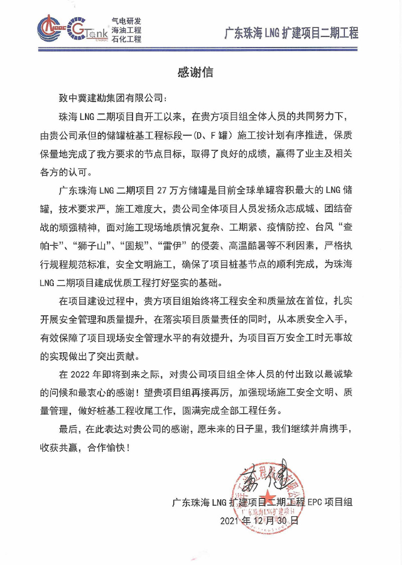 廣東珠海LNG二期項目27萬方儲罐是目前全球單罐容積最大的LNG儲罐,技術要求嚴,施工難度大。在施工工過程中,全體項目人員發(fā)揚眾志成城、團結奮戰(zhàn)的頑強精神,面對施工現(xiàn)場地質(zhì)情況復雜、工期緊、疫情防控、臺風“查帕卡”、“獅子山”、“圓規(guī)”、“雷伊”的侵襲、高溫酷暑等不利因素,迎難而上,頑強奮戰(zhàn),保質(zhì)、安全、高效地履行合同任務,確保了項目樁基節(jié)點的順利完成,為珠海LNG二期項目建成優(yōu)質(zhì)工程打好堅實基礎,為項目百萬安全工時無事故的實現(xiàn)做出了突出貢獻,受到業(yè)主及總包方的高度贊揚。