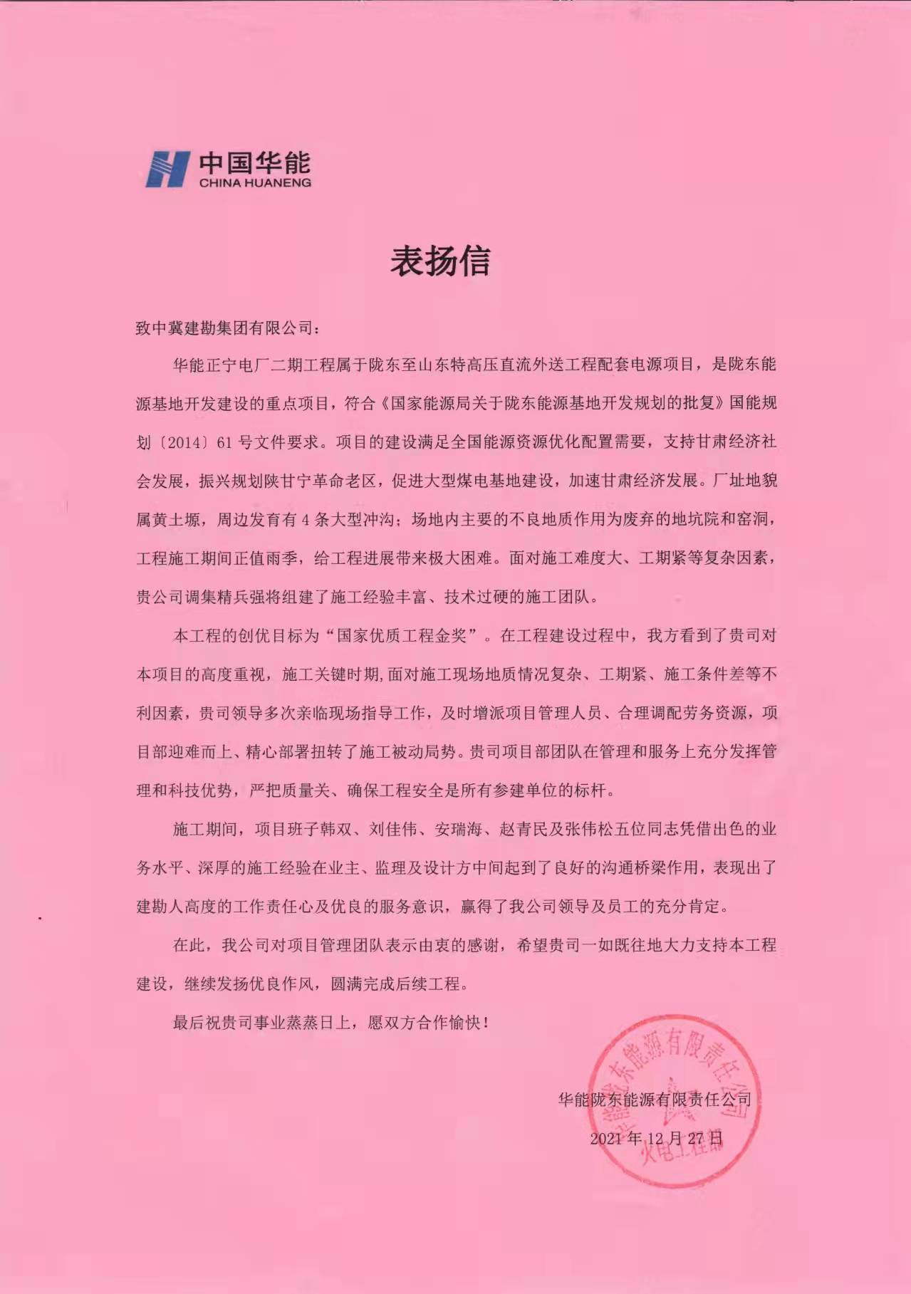 華能正寧電廠二期樁基工程屬于隴東至山東特高壓直流外送工程配套電源項(xiàng)目,是隴東能源基地開發(fā)建設(shè)的重點(diǎn)項(xiàng)目, 在工程建設(shè)過程中面對施工現(xiàn)場地質(zhì)情況復(fù)雜、工期緊、施工條件差等不利因素,項(xiàng)目部迎難而上、精心部署扭轉(zhuǎn)了施工被動(dòng)局勢。在管理和服務(wù)上充分發(fā)揮管理和科技優(yōu)勢,嚴(yán)把質(zhì)量關(guān)、確保工程安全是所有參建單位的標(biāo)桿。其中項(xiàng)目部班子韓雙、劉佳偉、趙青民、安瑞海及張偉松五位同志憑借出色的業(yè)務(wù)水平、深厚的施工經(jīng)驗(yàn)在業(yè)主、監(jiān)理及設(shè)計(jì)方中間起到了良好的溝通橋梁作用,表現(xiàn)出了建勘人高度的工作責(zé)任心及優(yōu)良的服務(wù)意識(shí),收到業(yè)主及監(jiān)理的高度贊揚(yáng)。