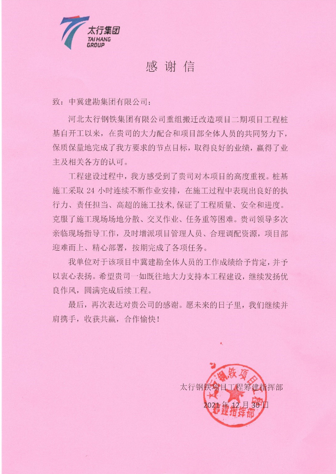 河北太行鋼鐵集團(tuán)有限公司重組搬遷改造項(xiàng)目二期項(xiàng)目樁基工程位于河北武安工業(yè)園區(qū)南洺河工業(yè)園。本項(xiàng)目包括焦電聯(lián)產(chǎn)、二期發(fā)電、洗煤廠及二期1座高爐等附屬設(shè)施。施工期間迫于業(yè)主工期要求,不斷增加區(qū)域和設(shè)備,同時(shí)涉及多處交叉施工,給施工開展及管理帶來了一定難度。通過公司的大力支持、項(xiàng)目部的統(tǒng)籌安排以及全體人員的辛苦付出。面對規(guī)模較大、場地分散、交叉施工等多項(xiàng)不利因素,項(xiàng)目全體人員盡職盡責(zé),確保項(xiàng)目順利開展,整個(gè)施工期間未發(fā)生安全質(zhì)量事故,各項(xiàng)指標(biāo)均滿足合同要求,充分發(fā)揮建勘精神。得到了業(yè)主的認(rèn)可和贊揚(yáng),并收到業(yè)主發(fā)來的表揚(yáng)信,為以后更多的合作奠定基礎(chǔ)。