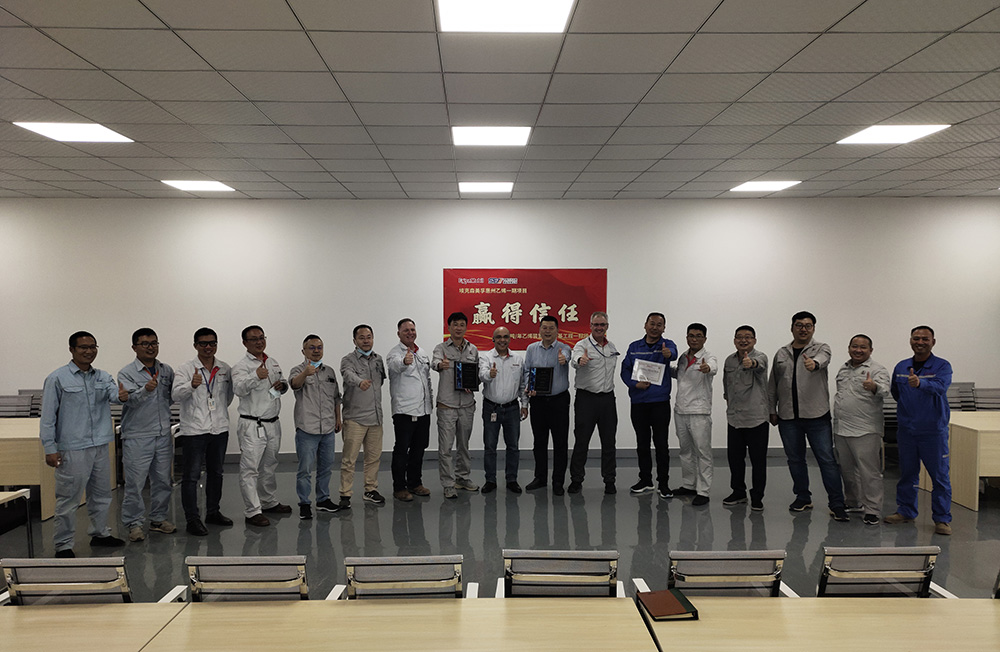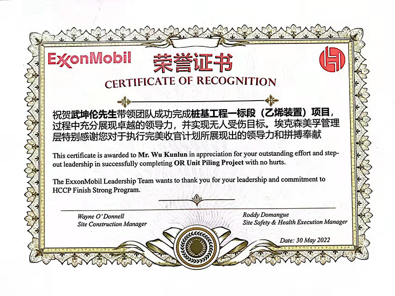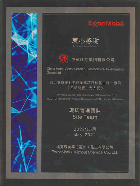 5月30日,??松梨冢ɑ葜荩┗び邢薰菊匍_2022年工作表彰大會,我公司參建的惠州美孚乙烯一期樁基工程項目部,在參建的30余家施工單位中以優(yōu)異的成績,榮獲“優(yōu)秀管理團(tuán)隊”稱號,生產(chǎn)設(shè)備科科長兼項目經(jīng)理武坤倫榮獲 “卓越領(lǐng)導(dǎo)力”個人榮譽證書,項目部每位員工都收到了業(yè)主頒發(fā)的獎品。