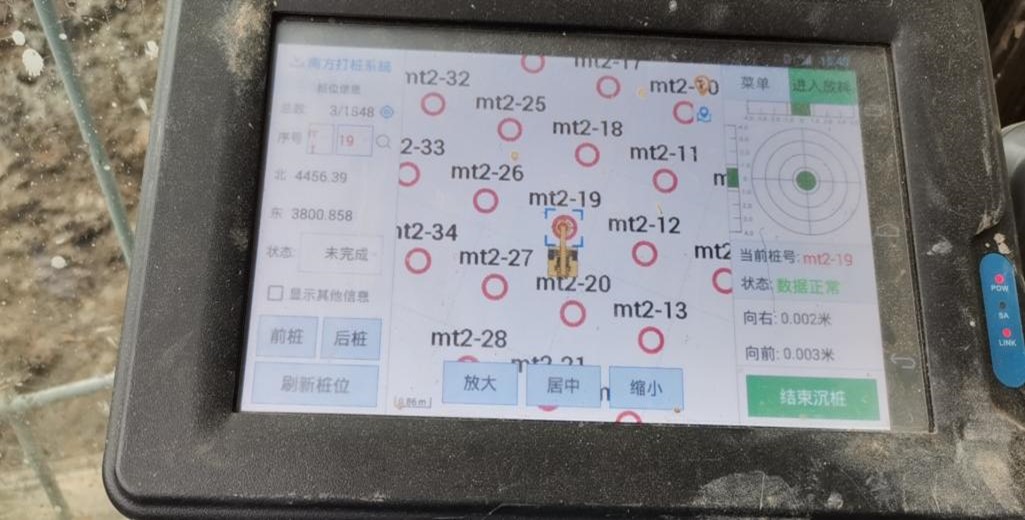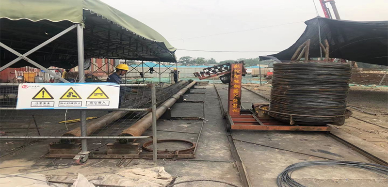 本工程自2021年2月21日開工,2022年3月21日完工,總歷時375天。2021年5月進入施工高峰期,使用旋挖鉆機9臺,每日完成樁數(shù)約 70根。由于測放樁位的工作量大,采用全站儀測放效率較低,影響施工進度,經(jīng)研究引進了智能打樁系統(tǒng)。在引進智能打樁系統(tǒng)后,先與全站儀測放的樁位進行對比測試,對其測放樁位的精度和效率進行了驗證,滿足精度要求,并在項目實施過程中及時總結(jié)使用經(jīng)驗,為進一步推廣智能化打樁系統(tǒng)的應(yīng)用打好基礎(chǔ)。本工程在鋼筋籠制作方面,采用了3臺滾籠機進行箍筋纏繞工作,提高了工作效率并減少了人員投入,保證了施工進度需要。