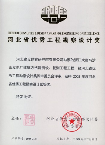 我公司承擔(dān)的浙江大唐烏沙山電廠建筑方格網(wǎng)測設(shè)、復(fù)測工程獲河北省優(yōu)秀工程勘察設(shè)計二等獎。