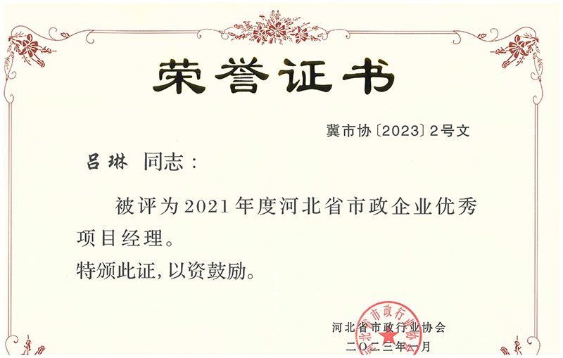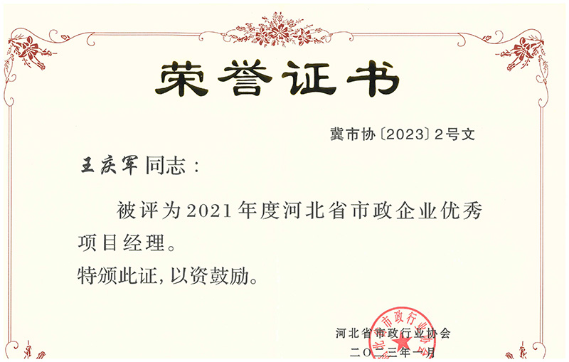 近日,經(jīng)河北省市政行業(yè)協(xié)會(huì)組織選拔并發(fā)文公布,我公司王慶軍同志、呂琳同志榮獲 “2021年度河北省市政企業(yè)優(yōu)秀項(xiàng)目經(jīng)理” 榮譽(yù)稱號(hào);陳軍紅同志、張樹楹同志榮獲“2022年度河北省市政企業(yè)優(yōu)秀項(xiàng)目總工程師”榮譽(yù)稱號(hào)。