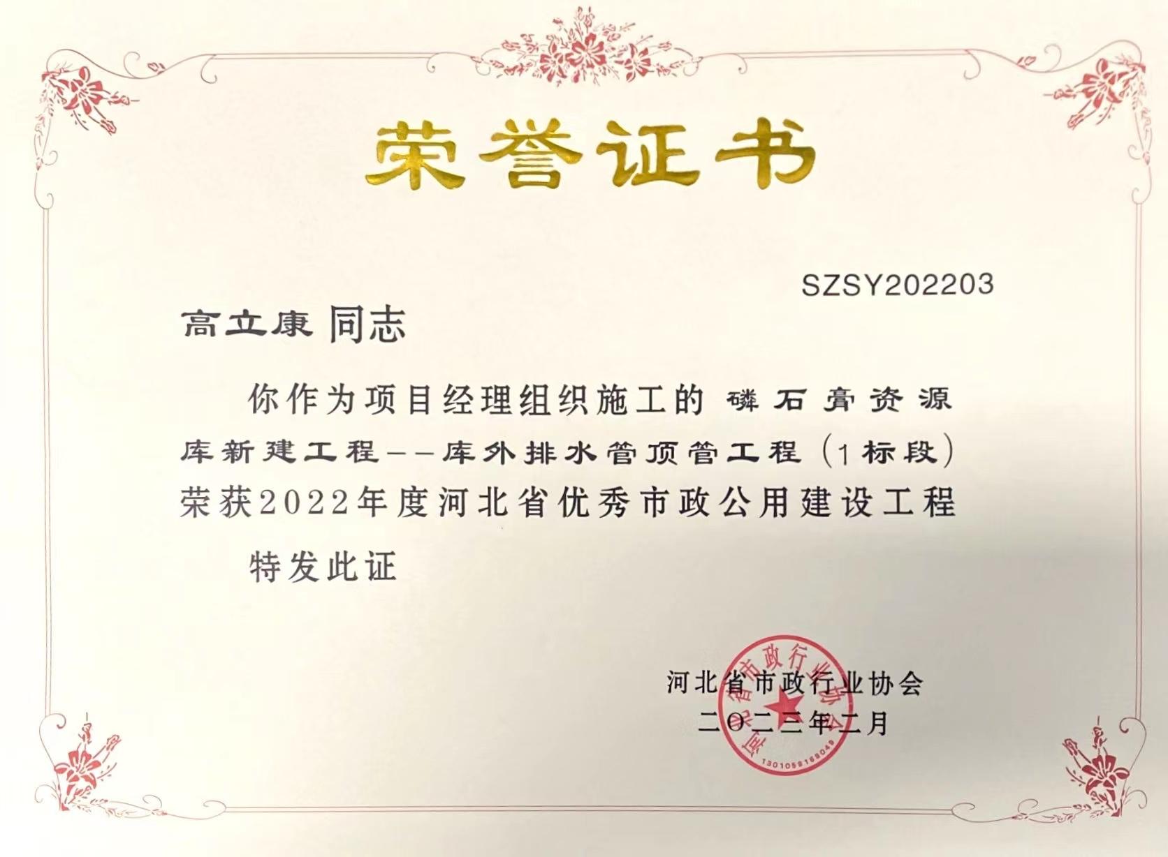 近日,河北省市政行業(yè)協(xié)會(huì)發(fā)布消息,經(jīng)過審核申報(bào)材料、查驗(yàn)施工現(xiàn)場(chǎng)、專家綜合評(píng)議,我公司市政工程項(xiàng)目“磷石膏資源庫新建工程——庫外水管頂管工程(1標(biāo)段)”被評(píng)為河北省優(yōu)秀市政公用建設(shè)工程,并為項(xiàng)目經(jīng)理高立康同志頒發(fā)了榮譽(yù)證書。