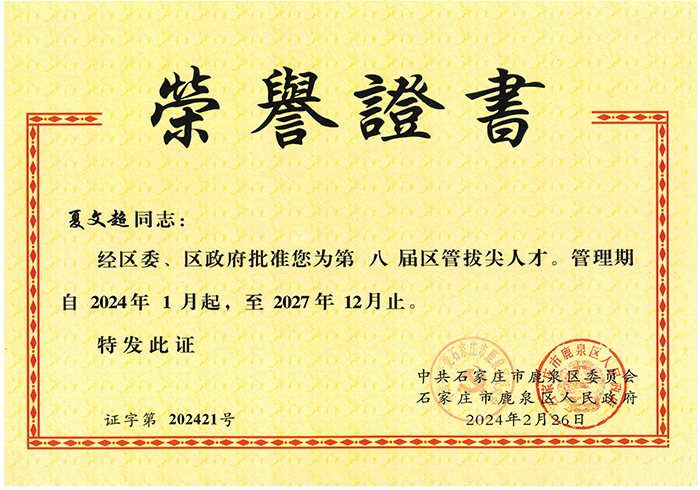 經(jīng)公司組織申報(bào),中共石家莊市鹿泉區(qū)委員會(huì)組織資格審核、綜合評(píng)審、征求意見、實(shí)地考察、區(qū)委常委會(huì)議研究等程序,我公司夏文超、劉雙辰入選石家莊市鹿泉區(qū)第八屆拔尖人才。