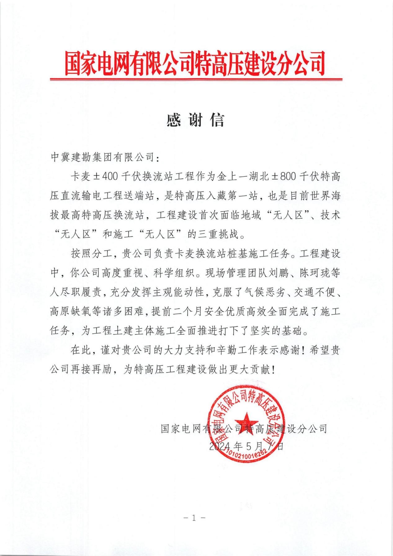 同時,業(yè)主及監(jiān)理給予了極高的贊譽(yù)與肯定,授予了我公司“優(yōu)秀承包商”的榮譽(yù)稱號;授予劉鵬同志“優(yōu)秀項(xiàng)目經(jīng)理”榮譽(yù)稱號;陳珂瓏同志“優(yōu)秀項(xiàng)目總工”榮譽(yù)稱號;紀(jì)曉蒙同志“優(yōu)秀項(xiàng)目副經(jīng)理”榮譽(yù)稱號;李鑫同志“優(yōu)秀安全總監(jiān)”榮譽(yù)稱號;張和平同志“優(yōu)秀項(xiàng)目質(zhì)檢員”榮譽(yù)稱號;魏耀文同志“優(yōu)秀項(xiàng)目技術(shù)員”榮譽(yù)稱號;張博杰同志“優(yōu)秀項(xiàng)目技術(shù)員”榮譽(yù)稱號;王美兵同志“優(yōu)秀項(xiàng)目施工員”榮譽(yù)稱號。此外,針對項(xiàng)目部在卡麥換流站做出的突出貢獻(xiàn),國網(wǎng)特高壓分公司特意撰寫了一份感謝信,對于我公司的施工履約能力給予肯定和感謝,期待后續(xù)工程繼續(xù)合作,再創(chuàng)佳績!