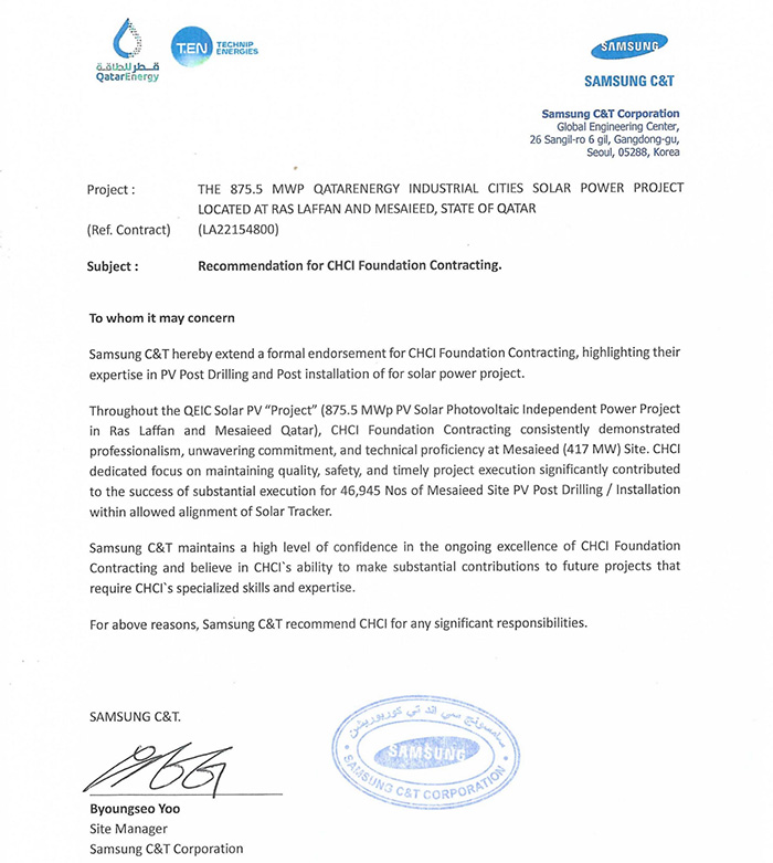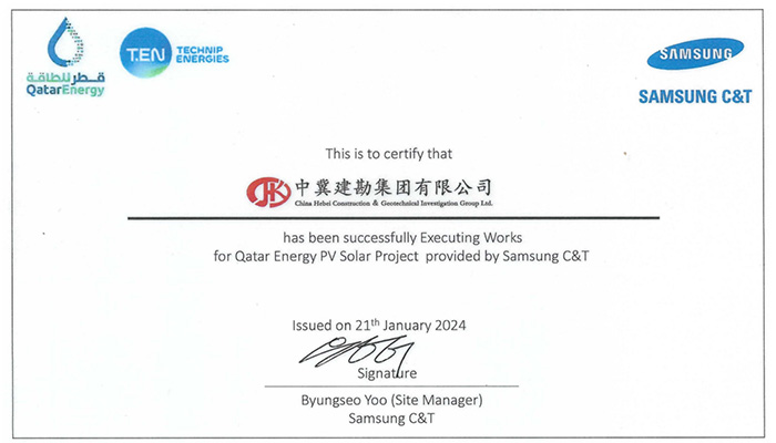 我公司收到卡塔爾能源875.5MW光伏發(fā)電項目業(yè)主方卡塔爾能源和總包方三星C&T公司聯(lián)合頒發(fā)的獎杯和推薦信。業(yè)主及總包方高度認可我公司項目履約能力,贊揚我司對該項目成功交付做出重大貢獻,表示愿意與我司建立長期合作關系?;谖宜咀吭降穆募s表現(xiàn),三星C&T公司授予我司推薦信。