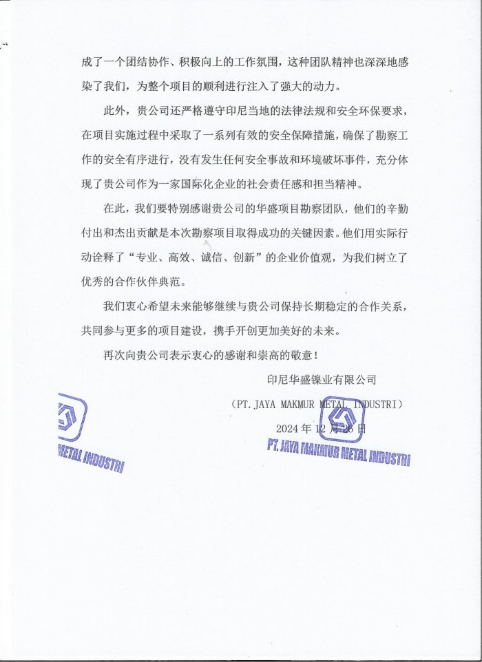 印尼華盛鎳業(yè)有限公司發(fā)來了表揚信。在印尼華盛鎳業(yè)有限公司一期冶煉廠、電廠地質(zhì)勘察項目及印尼華盛-年產(chǎn)200萬噸綜合鋼鐵項目的勘察任務(wù)中,印尼華盛勘察項目部全體職工迅速適應(yīng)印尼當(dāng)?shù)氐膹?fù)雜環(huán)境和炎熱的氣候條件,克服了語言溝通、文化差異以及交通不便等諸多困難,全身心地投入到工作中。在項目實施過程中,嚴(yán)格遵守印尼當(dāng)?shù)氐姆煞ㄒ?guī)和安全環(huán)保要求,采取了一系列有效的安全保障措施,確保了勘察工作的安全有序進行。這種高度的專業(yè)素養(yǎng)和社會責(zé)任感,贏得了業(yè)主方的高度贊揚和深深感激。