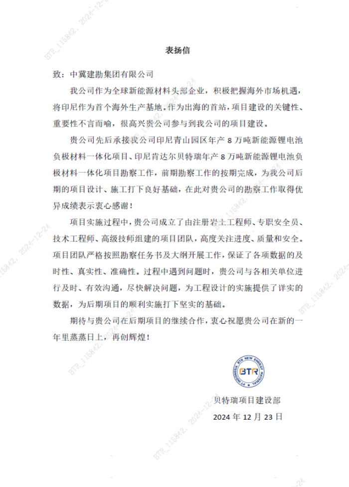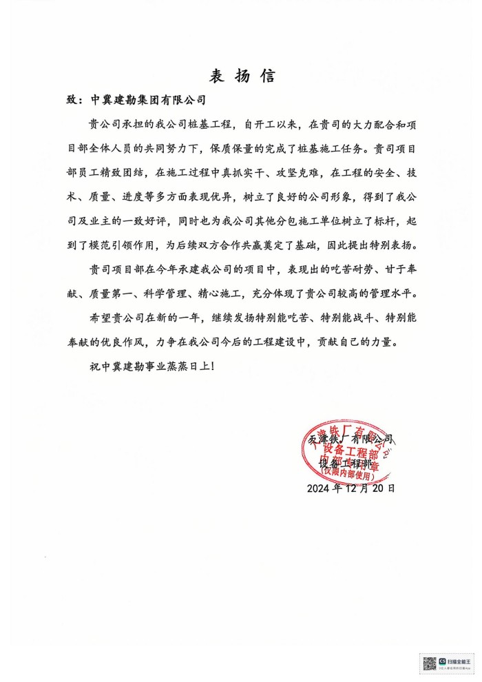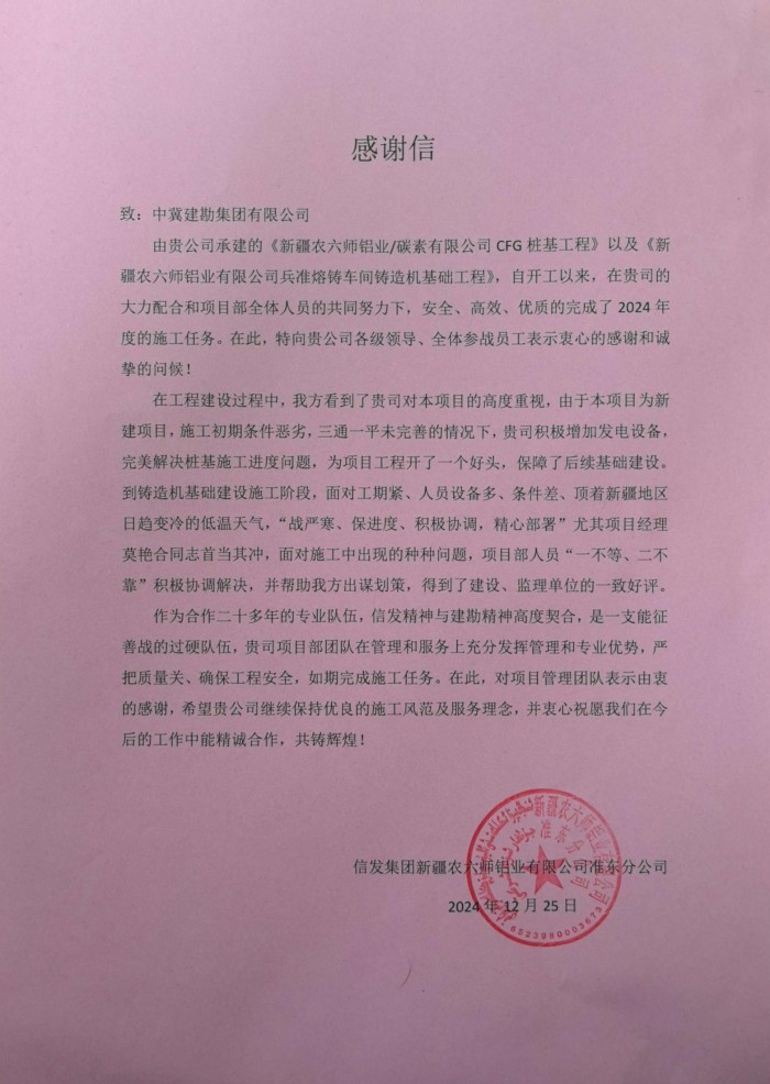 此外,我公司參與的新疆農(nóng)六師鋁業(yè)CFG樁項目、內(nèi)蒙古庫布齊沙漠鄂爾多斯中北部新能源基地光伏項目、深能保定西北郊熱電廠樁基礎(chǔ)工程等多個國內(nèi)外項目收到業(yè)主單位表揚信,對我公司在項目中的高效執(zhí)行、嚴(yán)謹(jǐn)管理和出色的團隊協(xié)作表示衷心感謝,并希望未來繼續(xù)與我公司保持緊密合作。