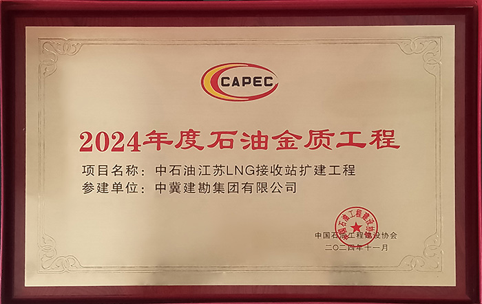 近日,集團(tuán)公司收到中國(guó)石油工程建設(shè)協(xié)會(huì)頒發(fā)的獎(jiǎng)牌,由二公司參建的中石油江蘇LNG接收站擴(kuò)建工程項(xiàng)目喜獲“2024年度石油金質(zhì)工程”。