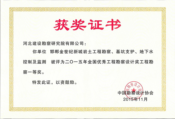 近日,公司兩項工程分別榮獲2015年度全國優(yōu)秀工程勘察設計工程勘察一、二等獎.一等獎:邯鄲金世紀新城巖土工程勘察、基坑支護、地下水控制及監(jiān)測;二等獎:河北開元環(huán)球中心巖土工程勘察。
