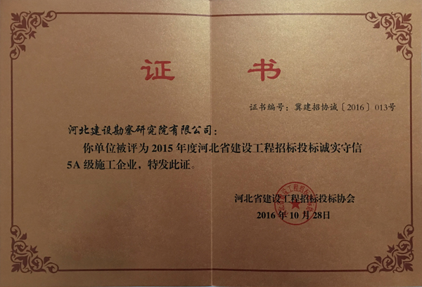 近日,公司被河北省建設工程招標投標協(xié)會評為2015年度河北省建設工程招標投標誠實守信5A級施工企業(yè)單位。