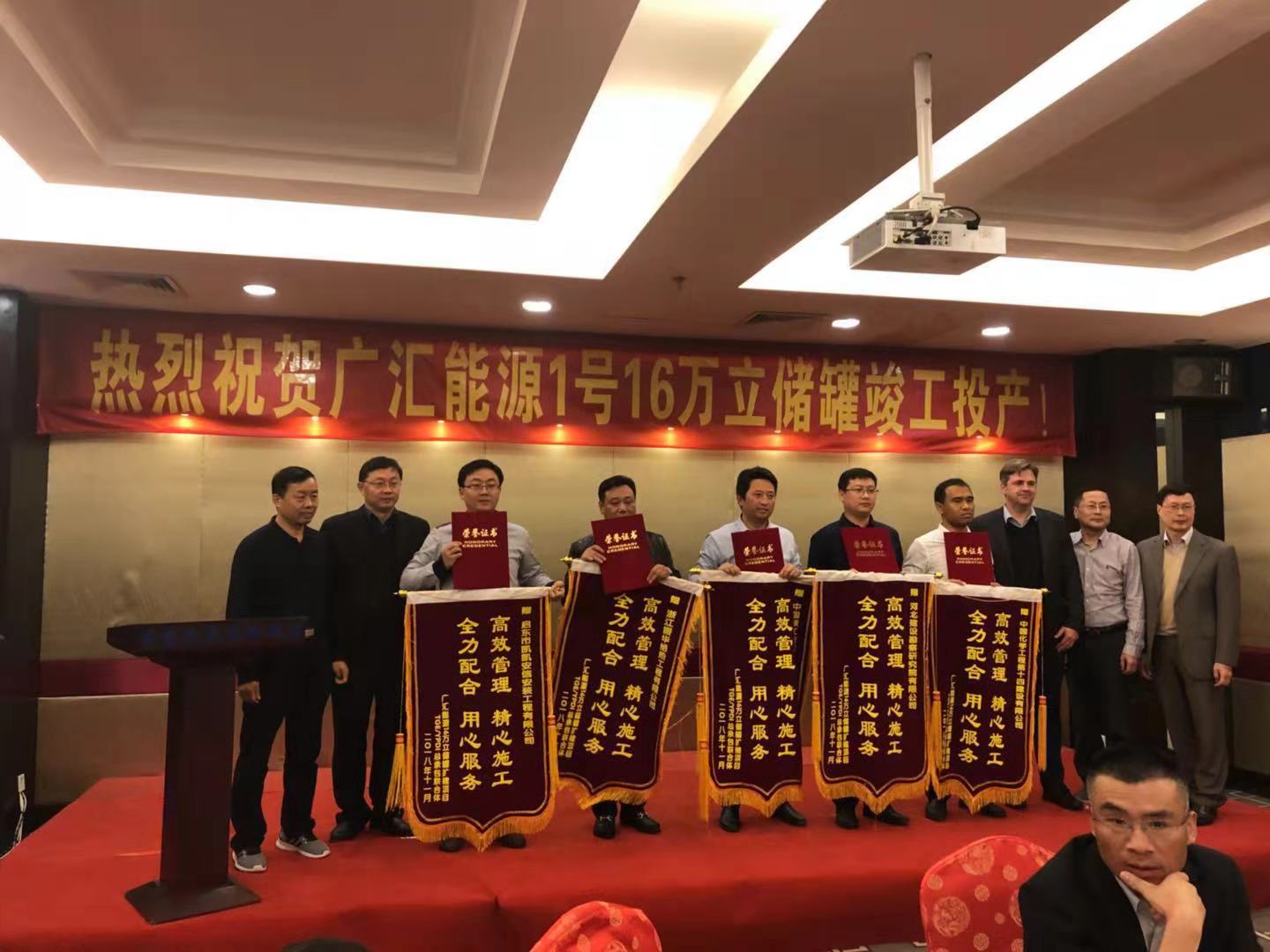 2018年11月21日,廣匯能源1號16萬m³儲罐項目順利投產,并創(chuàng)造了LNG行業(yè)新的記錄。在竣工投產慶功會上,廣匯能源總經理和TGE總經理對我公司在項目中的突出貢獻給予了高度贊揚,并授予錦旗和“優(yōu)秀分包商”證書,同時也對我公司在2號16萬立方儲罐施工過程中的優(yōu)秀表現提出了表揚,并期望我公司更多的參與廣匯能源的項目建設。