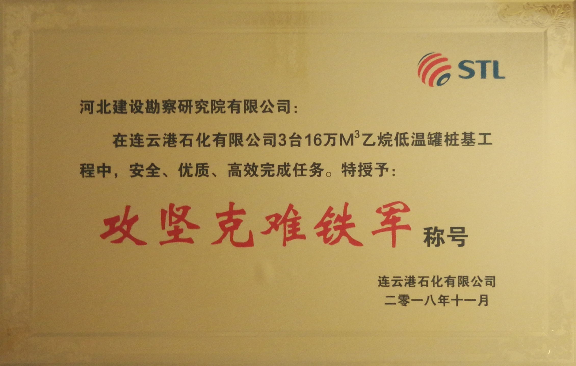 連云港石化有限公司320萬噸/年輕烴低溫儲罐樁基工程榮獲“攻堅(jiān)克難鐵軍”稱號