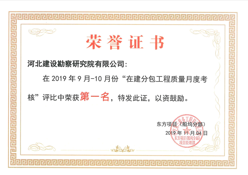 我公司俄羅斯東方船廠項(xiàng)目部,在2019年9月-10月份整個(gè)東方船廠項(xiàng)目十幾家施工單位質(zhì)量月度考核評(píng)比中,榮獲第一名的好成績(jī)。