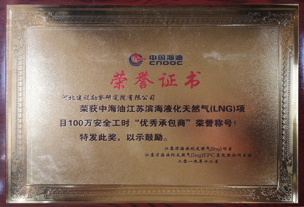由我公司承建的江蘇液化天然氣(LNG)接收站1#、2#儲罐樁基工程已于2019年09月01日施工完成,2019年12月01日全部檢測完成,樁基檢測結(jié)果全為Ⅰ類樁。在施工期間的質(zhì)量安全管理及我公司項目部的工作作風和工作態(tài)度受到了總包、監(jiān)理及業(yè)主單位的充分肯定。在江蘇液化天然氣(LNG)接收站工程項目完工之際,為我公司頒發(fā)了“優(yōu)秀承包商”證書。在建設(shè)單位組織的“儲罐樁基工程資料質(zhì)量勞動競賽”中,通過項目部的努力及公司的全力幫助,獲得優(yōu)勝獎。