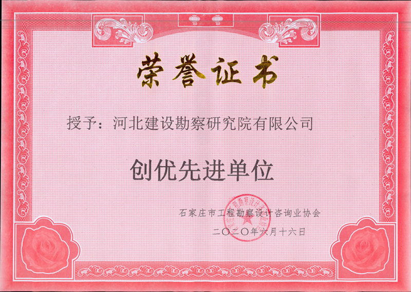 2020年6月22日,石家莊市工程勘察設(shè)計咨詢業(yè)協(xié)會下發(fā)文件《關(guān)于公布2020年度優(yōu)秀工程勘察設(shè)計行業(yè)獎評選結(jié)果的通知》(石設(shè)協(xié)字[2020]5號),我公司被授予“創(chuàng)優(yōu)先進單位”稱號;公司申報的江蘇LNG接收站擴建工程T-1206號LNG儲罐工程等6個項目獲評2020年度石家莊市優(yōu)秀工程勘察設(shè)計行業(yè)一等獎,巴基斯坦薩希瓦爾華能如意2×660MW燃煤電站項目地基加固處理工程等11個項目獲評2020年度石家莊市優(yōu)秀工程勘察設(shè)計行業(yè)二等獎,霸州市生活垃圾焚燒發(fā)電廠項目樁基施工工程等8個項目獲評2020年度石家莊市優(yōu)秀工程勘察設(shè)計行業(yè)三等獎。