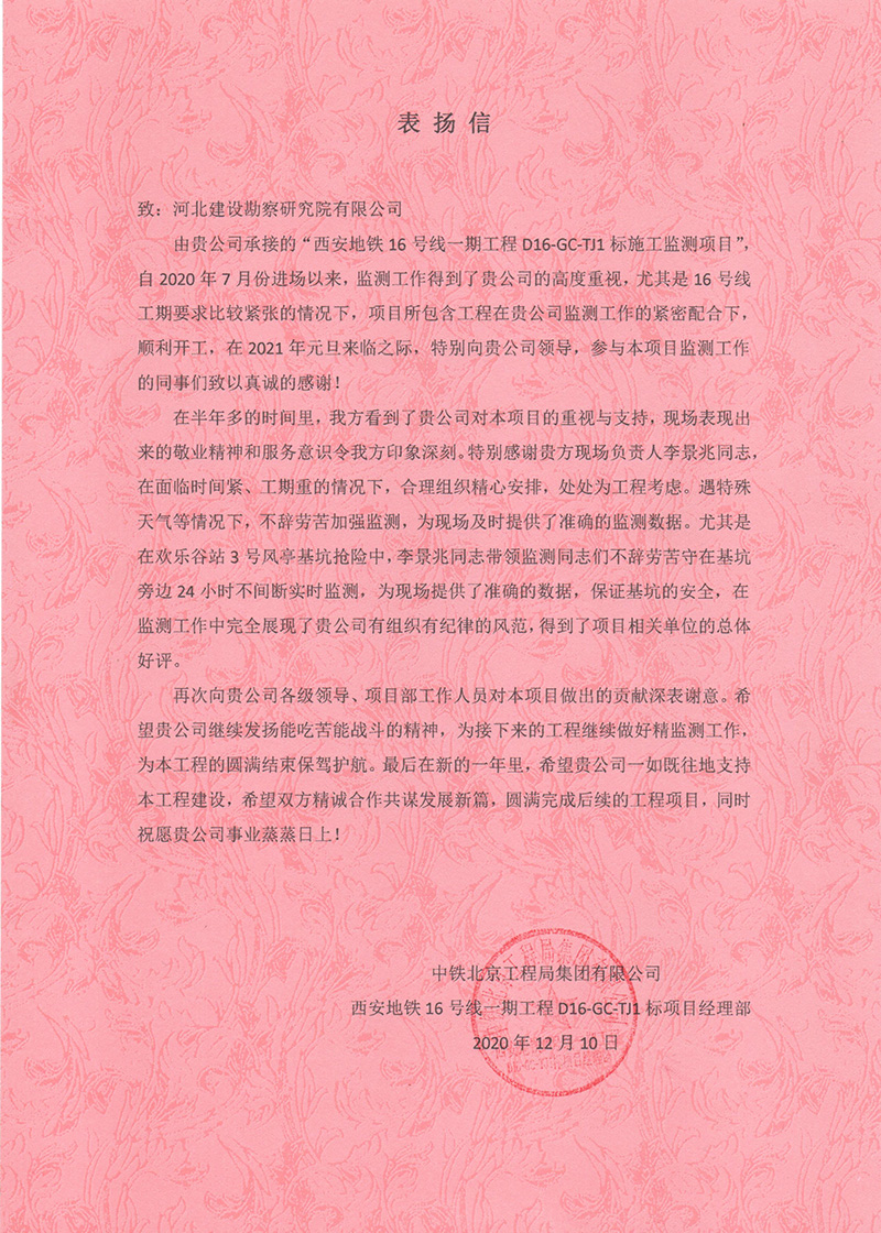 近日,公司收到中鐵北京工程局集團(tuán)有限公司西安地鐵16號線一期工程D16-GC-TJ1標(biāo)項(xiàng)目經(jīng)理部的表揚(yáng)信。
