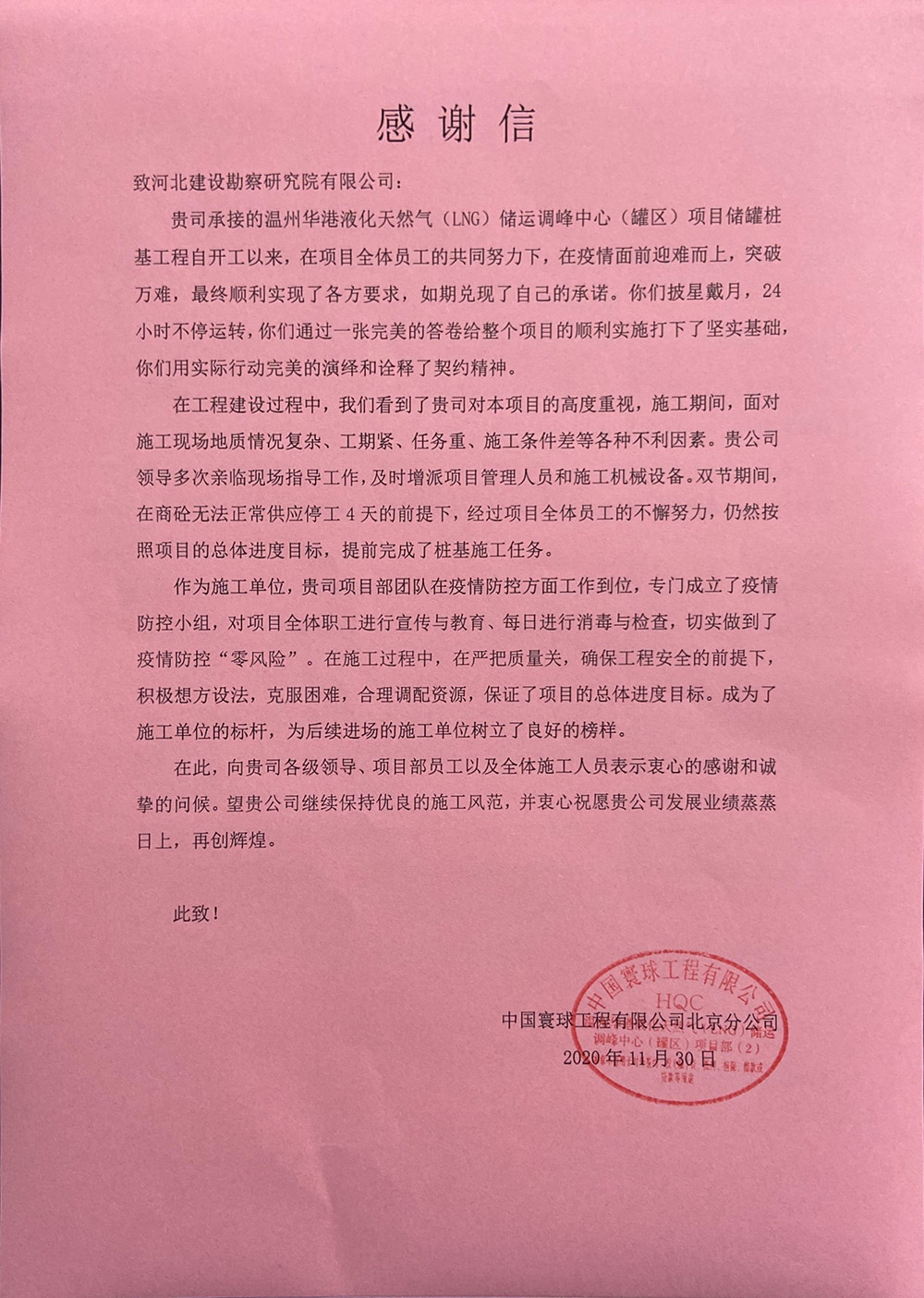 溫州華港LNG項(xiàng)目自2020年8月19日開工以來,面對(duì)地質(zhì)情況復(fù)雜、工期緊、任務(wù)重、施工條件差等諸多不利因素,項(xiàng)目部精心部署工作,科學(xué)組織生產(chǎn),全體員工大力發(fā)揚(yáng)“不怕累、不怕苦、全力打造精品工程”的精神,在嚴(yán)格落實(shí)疫情防控措施的同時(shí),嚴(yán)把進(jìn)度關(guān)、質(zhì)量關(guān)、安全關(guān),確保制定的施工計(jì)劃有序推進(jìn),最終高標(biāo)準(zhǔn)完成項(xiàng)目施工,兌現(xiàn)了公司的承諾,為溫州華港LNG工程的竣工投產(chǎn)奠定了堅(jiān)實(shí)的基礎(chǔ)。為此,業(yè)主、總包、監(jiān)理紛紛發(fā)來表揚(yáng)信,對(duì)我項(xiàng)目部提出表揚(yáng),并衷心祝愿我公司發(fā)展業(yè)績蒸蒸日上,再創(chuàng)輝煌。