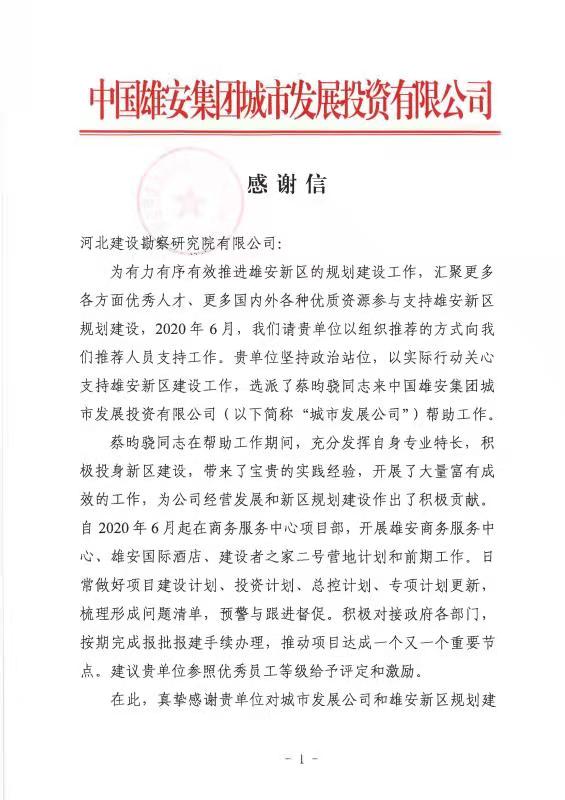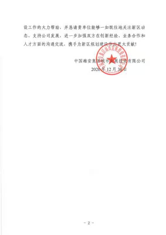 中國雄安集團(tuán)城市發(fā)展投資有限公司感謝我公司以實際行動關(guān)心支持雄安新區(qū)建設(shè)工作,希望我公司一如既往地關(guān)注新區(qū)動態(tài),支持公司發(fā)展,進(jìn)一步加強雙方在創(chuàng)新經(jīng)驗、業(yè)務(wù)合作和人才方面的溝通交流,攜手為新區(qū)規(guī)劃建設(shè)作出更大貢獻(xiàn)。