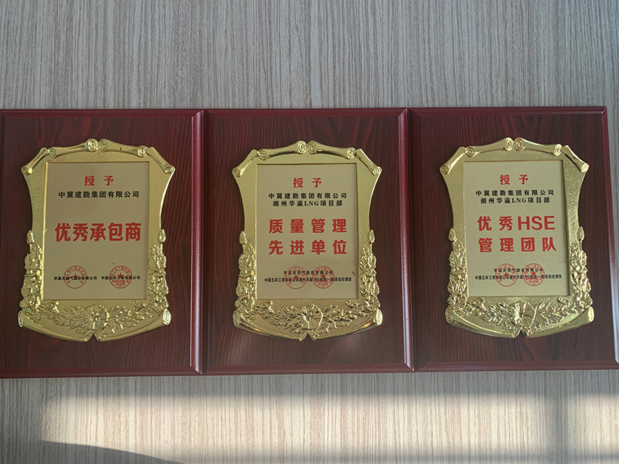 近日,由我公司承建的潮州華瀛液化天然氣接收站項(xiàng)目儲罐工程樁基施工項(xiàng)目,榮獲華瀛天然氣股份有限公司和中國五環(huán)工程有限公司潮州華瀛LNG項(xiàng)目部頒發(fā)的“優(yōu)秀承包商”、“質(zhì)量管理先進(jìn)單位”和“優(yōu)秀HSE管理團(tuán)隊(duì)”的榮譽(yù)獎牌以及感謝信。