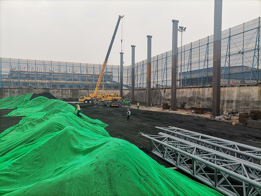 北海一電4*B60MW機(jī)組煤場(chǎng)封閉土建改造工程,位于濱州市北海新區(qū)馬山子鎮(zhèn),露天煤場(chǎng)南北方向長(zhǎng)約153米,東西方向?qū)捈s102米,高度約12米?;炷粱A(chǔ)為C40,墊層為C20素混凝土。本項(xiàng)目特點(diǎn):