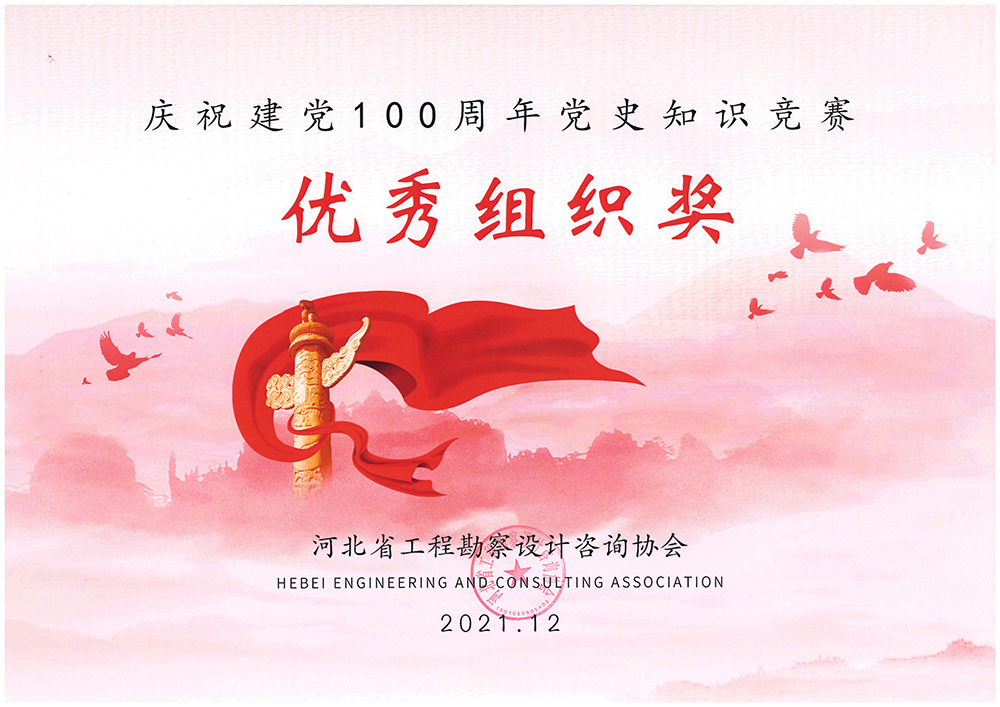 2021年,為隆重慶祝中國(guó)共產(chǎn)黨成立 100 周年,號(hào)召?gòu)V大黨員群眾進(jìn)一步了解黨的百年奮斗史,以史為鑒,砥礪前行,為行業(yè)高質(zhì)量發(fā)展作出積極貢獻(xiàn),河北省工程勘察設(shè)計(jì)咨詢協(xié)會(huì)主辦了以“重溫黨史,不忘初心”為主題的黨史知識(shí)學(xué)習(xí)競(jìng)賽活動(dòng)。公司黨委組織公司廣大黨員群眾積極踴躍參加,并取得較好學(xué)習(xí)效果。近日,被河北省工程勘察設(shè)計(jì)咨詢協(xié)會(huì)授予“優(yōu)秀組織獎(jiǎng)”。