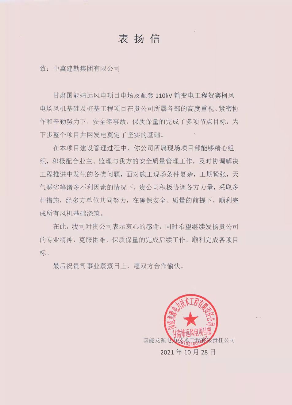 江蘇鳳城梅里500千伏線路工程長江大跨越項目樁基工程,甘肅國能靖遠風電項目電場及配套110KV輸變電工程賀寨柯風電場風機基礎及樁基工程項目業(yè)主向我公司發(fā)來表揚信,并頒發(fā)了“進度、質(zhì)量管理先進單位”榮譽證書,同時,武衛(wèi)新、朱凱云、黃長楠被評為“優(yōu)秀項目管理者”榮譽稱號。