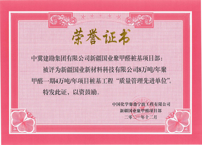新疆國業(yè)新材料科技有限公司8萬噸/年聚甲醛一期4萬噸/年項目樁基工程榮獲“質(zhì)量先進單位”。