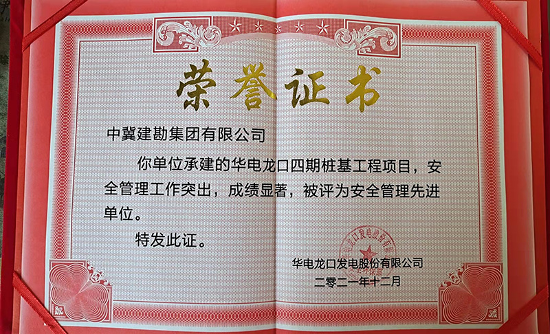 華電龍口四期樁基工程項目安全工作管理突出,被頒發(fā)“安全管理先進單位”榮譽證書,張金根被評為“安全管理先進個人”榮譽稱號。