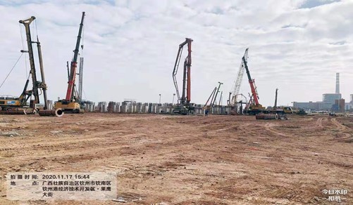 本工程位于廣西欽州港。受廣西華誼新材料有限公司委托,我公司承擔(dān)本項目樁基施工。采用自有的“樁柱一體”施工工法、長臂挖掘機(jī)振動下設(shè)長護(hù)筒、標(biāo)準(zhǔn)化泥漿池、快速機(jī)械連接、旋挖鉆機(jī)入巖等施工工藝和新方法共計完成4093根灌注樁,PHC管樁1759根。