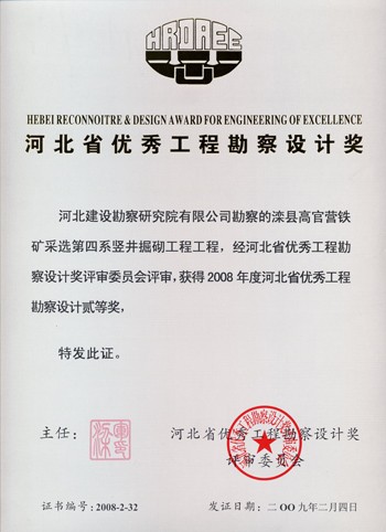 灤縣高官營(yíng)鐵礦采選第四采豎井掘砌工程獲河北省優(yōu)秀工程勘察設(shè)計(jì)二等獎(jiǎng)。