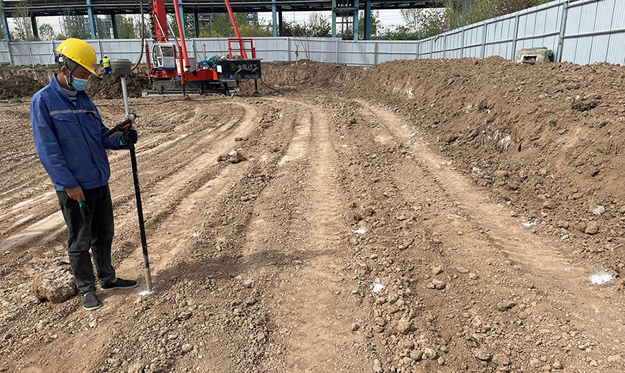 本工程自2022年4月19日開工,2022年6月18日完工,包含CFG樁施工,樁間土開挖及外運,截樁頭,樁基檢測,褥墊層施工和工程降水。其中鑄造車間共有CFG樁約900根,樁徑為500mm,有效樁長為14.5-15.0m,土方開挖及外運約1200m³,樁間土開挖及外運約2500m³,褥墊層鋪設約680m³;2萬噸聯(lián)合法車間共有CFG樁約3900根,樁徑為500mm,有效樁長為13m,土方開挖及外運約8000m³,樁間土開挖及外運約4400m³,褥墊層鋪設約2500m³。