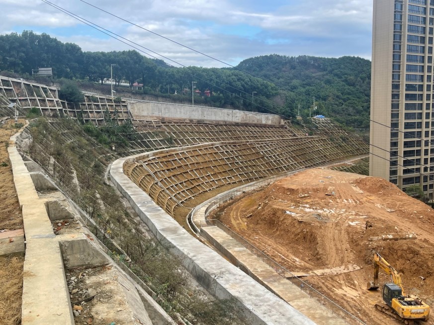 本工程位于浙江省永嘉縣甌北街道烏山路嶼塘山桃源陵園路段,本工程為大型地質(zhì)災(zāi)害治理施工項(xiàng)目,主要施工內(nèi)容包括邊坡削坡、人工挖孔樁、鉆孔灌注樁、微型樁、錨桿格構(gòu)、毛石擋墻、板肋式擋墻、扶壁擋墻、盲溝、截排水溝、深部排水孔、錨索、護(hù)欄欄桿、樁間擋板、平臺(tái)硬化、噴坡綠化、路面修復(fù)等。