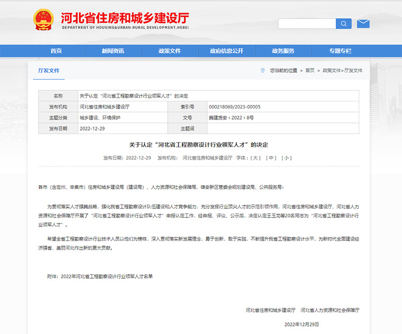 為貫徹落實人才強冀戰(zhàn)略,強化我省工程勘察設計隊伍建設和人才競爭能力,充分發(fā)揮行業(yè)頂尖人才的示范引領作用,近日,河北省住房和城鄉(xiāng)建設廳、河北省人力資源和社會保障廳聯(lián)合印發(fā)《關于認定“河北省工程勘察設計行業(yè)領軍人才”的決定》,我公司梁書奇同志被認定為“河北省工程勘察設計行業(yè)領軍人才”。